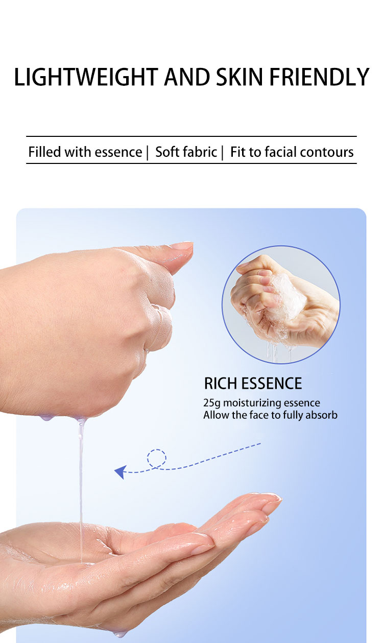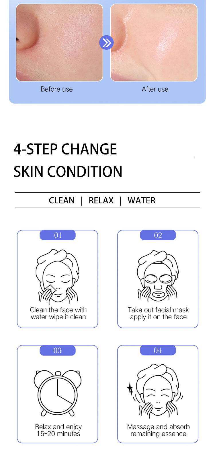 Before using the facial mask, make sure to thoroughly clean your face. Wet a towel with warm water and gently apply it to your face. Take out the mask, unfold it gently and press it onto your face in accordance with the contours of your face. |